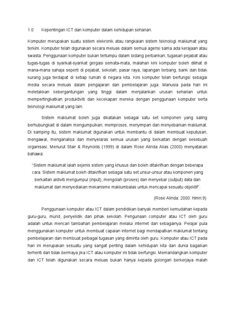 1.0 kepentingan ict dan komputer dalam kehidupan seharian. Untuk membolehkan pengukuran yang diambil oleh ahli sains yang berbeza supaya lebih selaras. Tidak mendahulukan kepentingan pribadi di atas kepentingan pribadi dan golongan. Komputer digunakan secara meluas dalam sektor perbankan untuk memudahkan urusan penyimpanan dan pengeluaran wang. Teknologi yang kita ada sekarang kebanyakannya bermula dengan eksplorasi angkasa lepas yang mana ia memerlukan tahap kejuruteraan dan pengaplikasian teknologi tertinggi, kemudian di komersialkan untuk keperluan seharian kita.