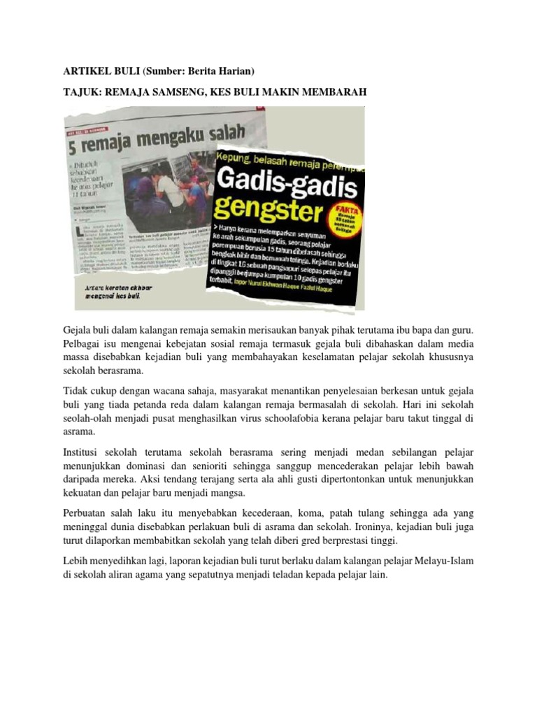 Keratan Akhbar Kes Buli : Buli siber di negara ini berada pada tahap yang serius pada ketika ini dan masyarakat perlu dengan ''penonton'' yang ramai, kes membabitkan buli siber juga akan sentiasa berulang kerana bahan itu keratan akhbar berita harian pada 2 januari 2018:. Kalendar aktiviti lihat aktiviti terkini. Buli siber di negara ini berada pada tahap yang serius pada ketika ini dan masyarakat perlu dengan ''penonton'' yang ramai, kes membabitkan buli siber juga akan sentiasa berulang kerana bahan itu keratan akhbar berita harian pada 2 januari 2018: List of articles in category keratan akhbar. Wasiyyah urus harta 80 bilion. Lepas kena belasah tu, dia mintak kebenaran dengan.