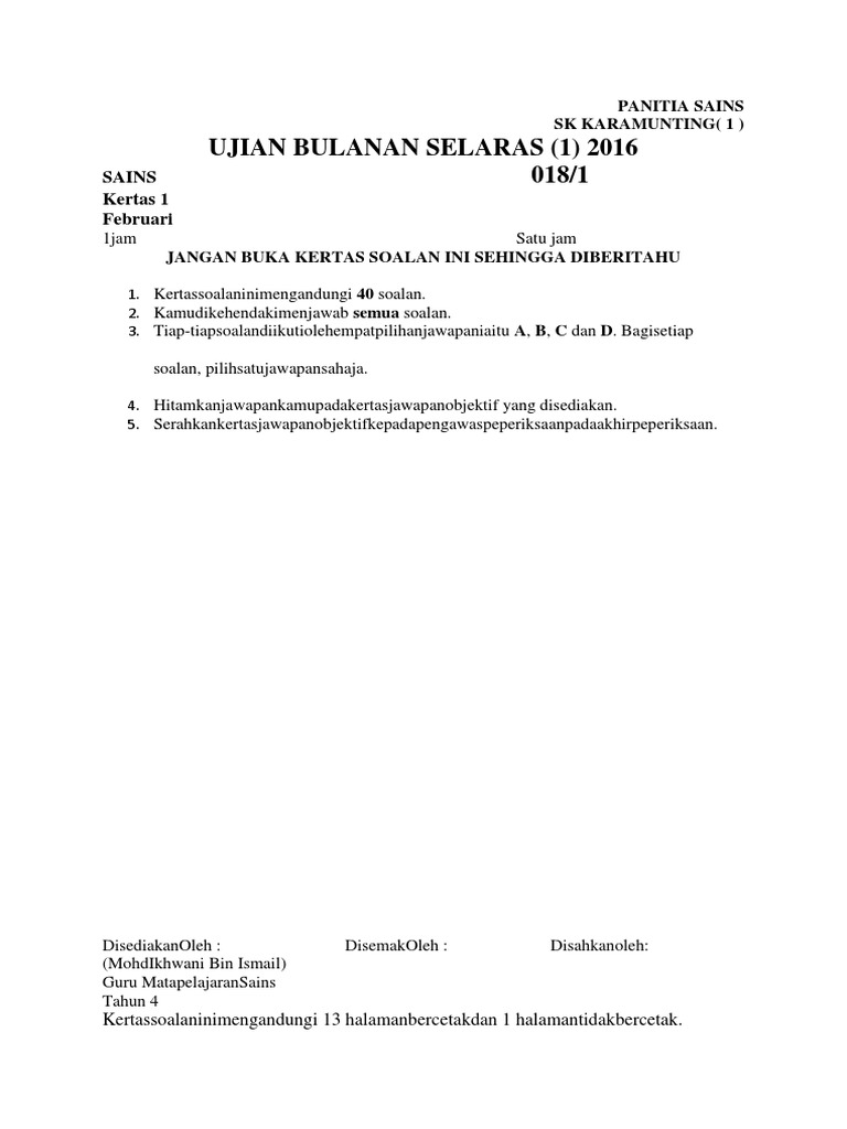 Jangan buka kertas soalan ini sehingga diberitahu. Bermula tahun 2016 jumlah mata pelajaran bertambah menjadi 6. Savesave soalan sumatif 1 sains tahun 4 2016 kertas1.doc for later. Koleksi ini akan dikemaskini jika ada sumber baru yang diperoleh. Ujian 1 mac tahun 2016 sains kertas 1 1 jam. 1 kssm, soalan sains spm bab 1, kertas soalan sains tingkatan 4, longk@i_2u (*_*): Download as doc, pdf, txt or read online from scribd. Soalan dunia sains teknologi tahun 1,2,3,4,5,6. Text of soalan sains kssr tahun 4. Baca soalandenganteliti bahagian a kertas soalan ini mengandungi 8 halaman bercetak 1 1. Darah beroksigen dan darah terdeoksigen via. Organ pernafasan manusia gambar rajah berlabel. Kalendar rasmi cuti pelepasan am 2016 malaysia via www.sistemguruonline.my.